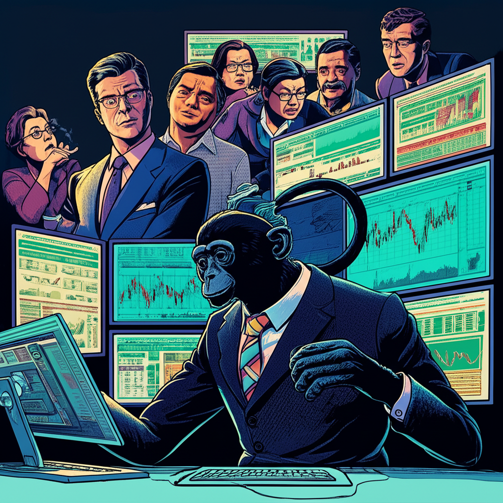 ภาพประกอบลิงดำในชุดสูทกำลังเทรดหน้าจอกราฟดิจิทัล นักลงทุนไทยมองด้วยความสนใจ