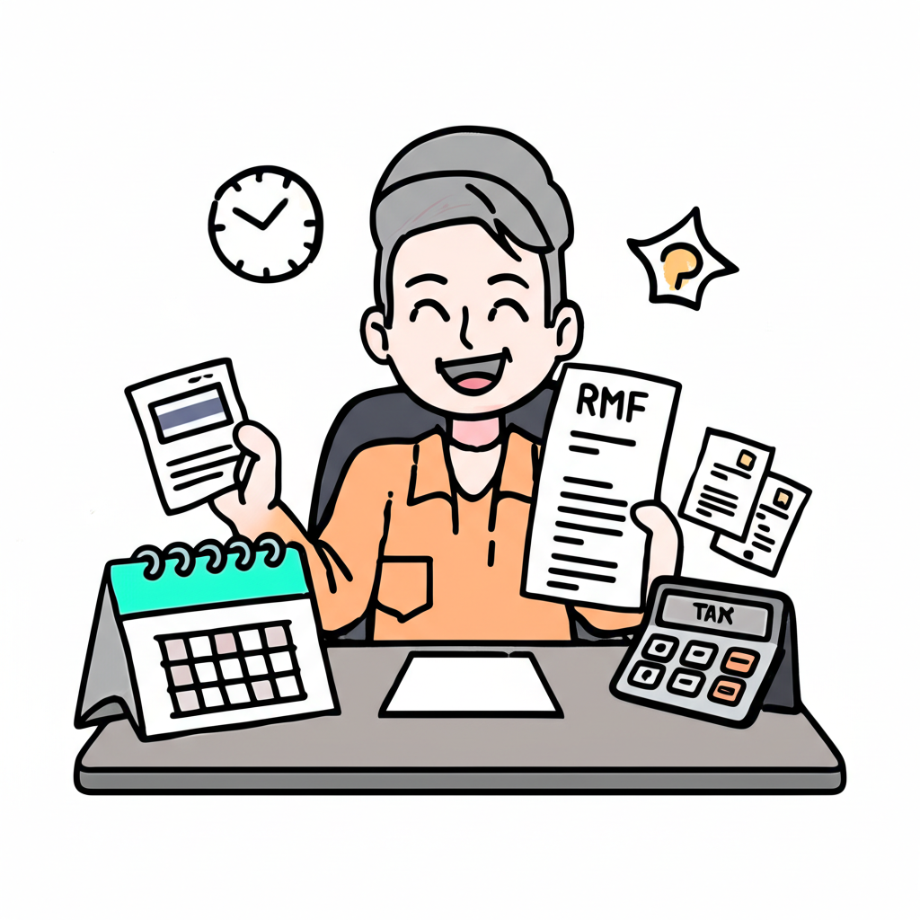 ภาพประกอบคนไทยวางแผนเกษียณและประหยัดภาษีด้วยเอกสาร RMF และปฏิทินที่ยิ้มแย้ม
