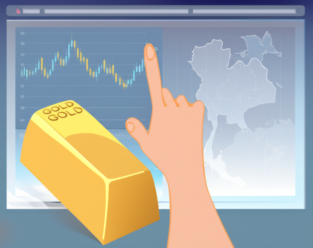 ภาพประกอบผู้ติดตามราคาทองคำบนหน้าจอพร้อมแท่งทองและแผนที่ประเทศไทย
